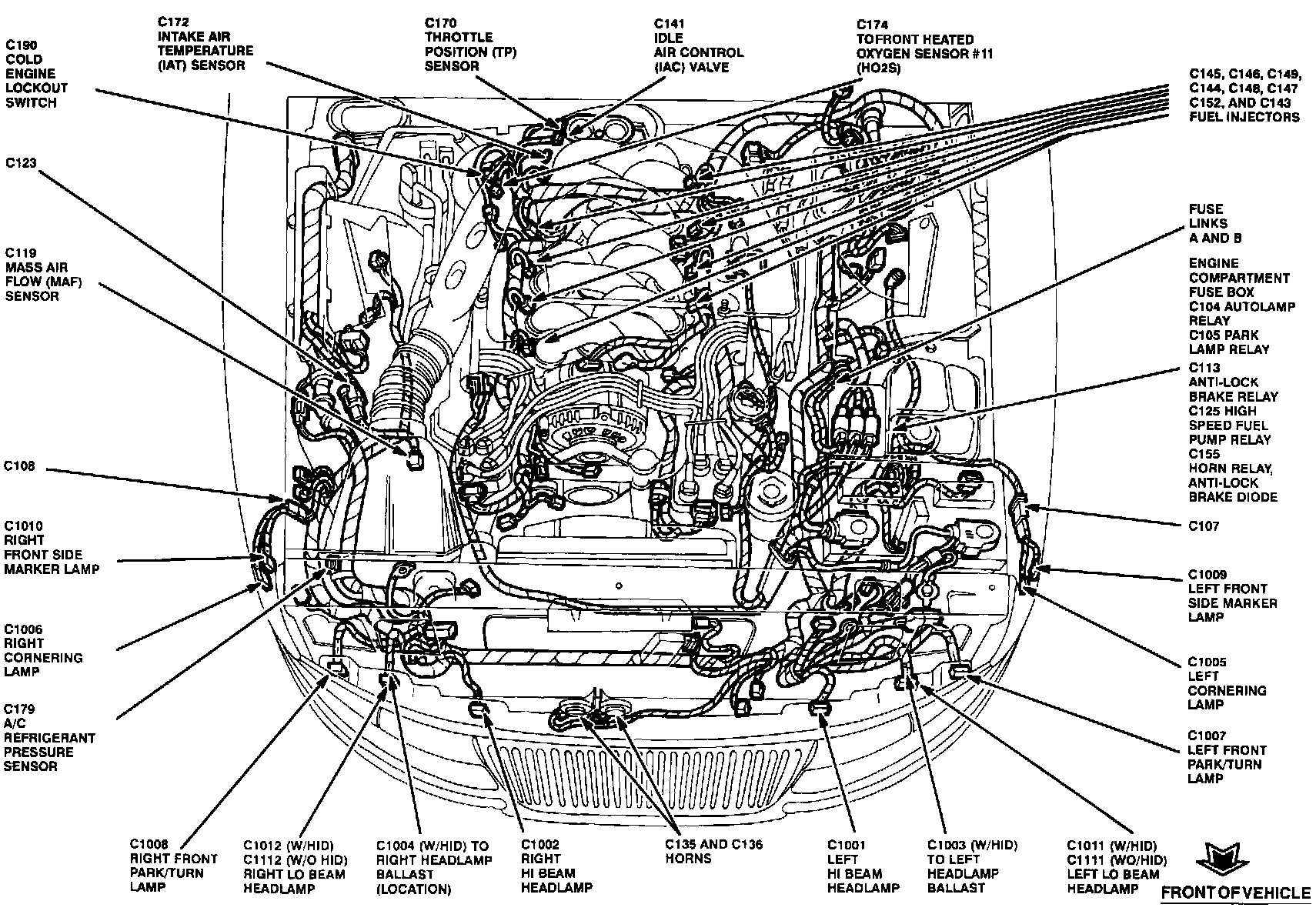 The Mass Air Flow Sensor is located at the RH front corner of the engine compartment.