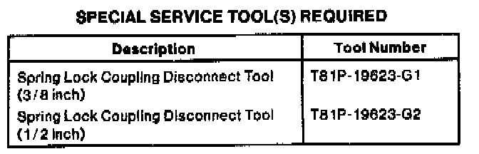 3. NOTE: Whenever the A/C evaporator core housing is removed, it will be necessary to replace the suction accumulator / drier. Disconnect the evaporator to compressor suction line from the suction accumulator/drier using Spring Lock Coupling Disconnect Tool T81P-19623-G1 or G2 and plug the openings to prevent dirt and excessive moisture from entering. Position the hose away from suction accumulator / drier assembly.