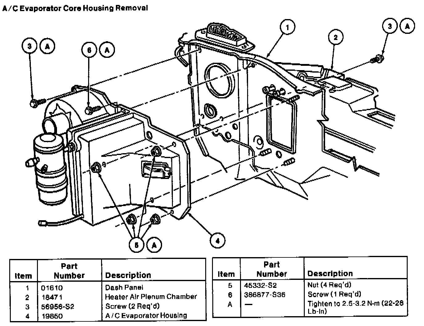 4. Replace the two screws (one drill point and one sheet metal) and tighten to 2.5-3.2 N-m (22-28 lb-in). Be careful to return the drill point screw to the correct hole which is located on top of the A / C evaporator core housing and to the right of the A/C blower motor and blower motor wheel assembly. Tighten the three stud nuts previously installed to 2.5-3.2 N-m (22-28 lb-in).
