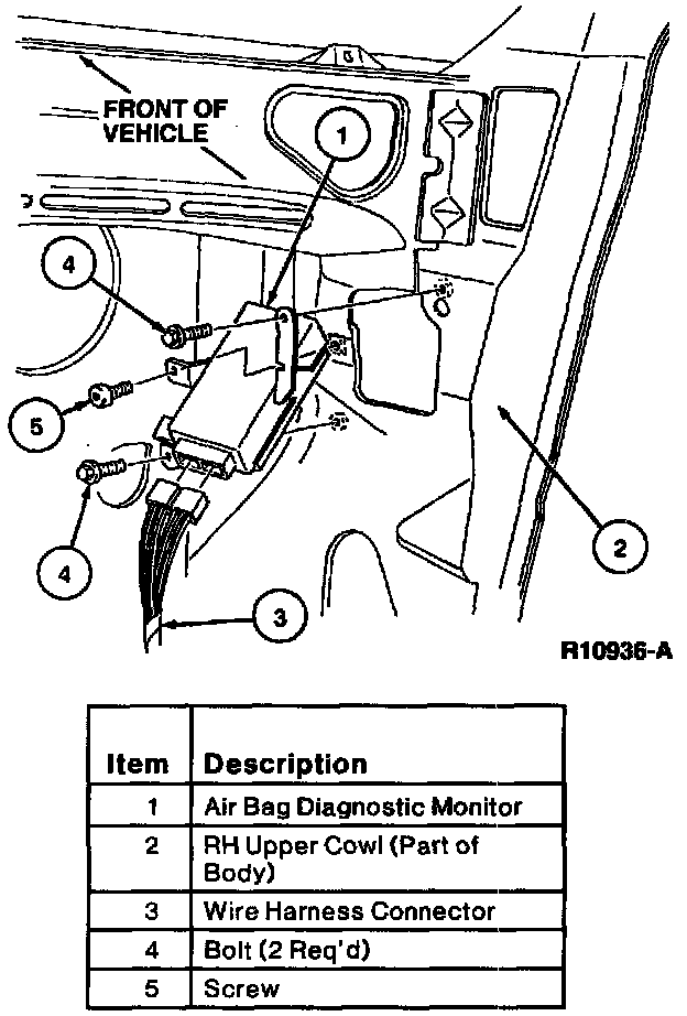 1. In stall air bag diagnostic monitor on the RH upper cow and secure with three retaining screws.