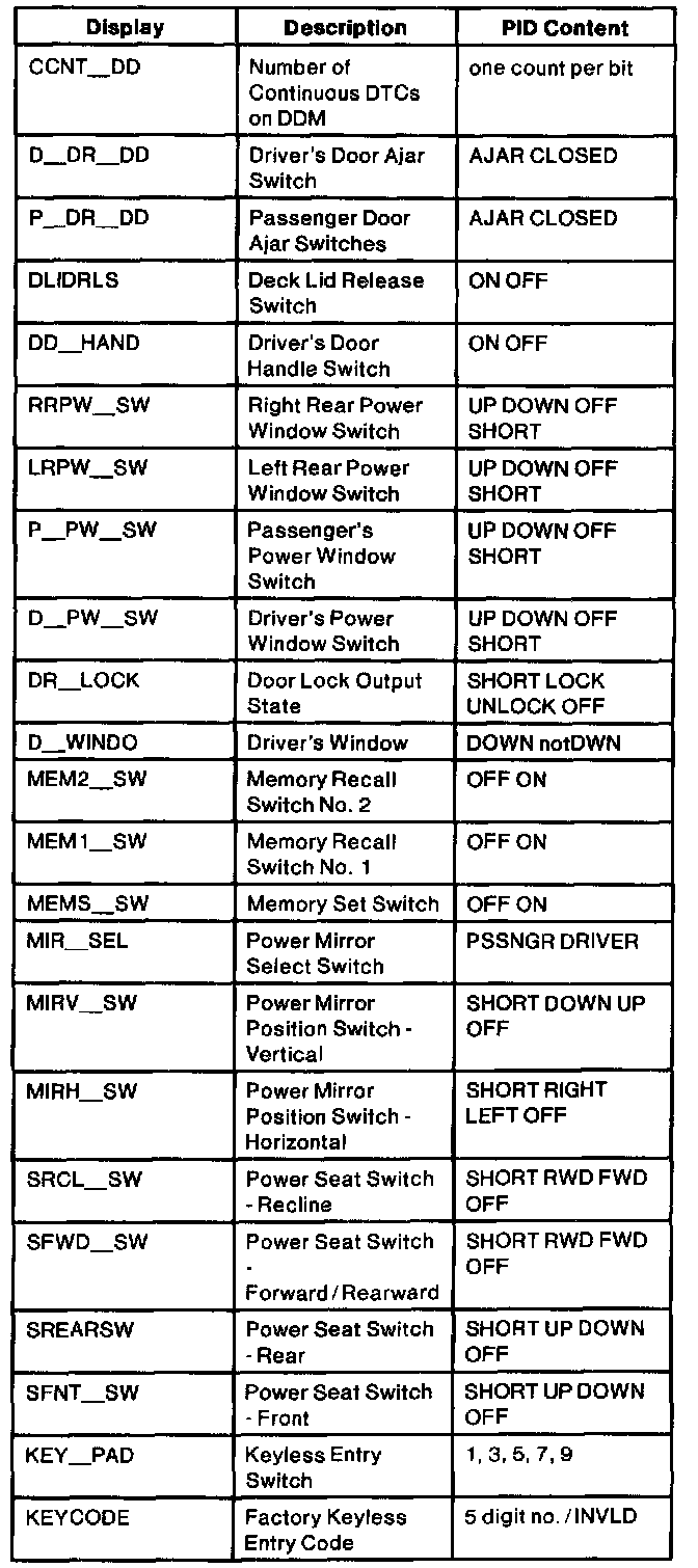 Driver Door Module (DDM) Parameter Identification (PID) Index