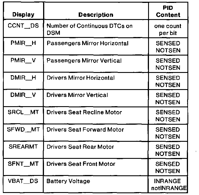 Driver Seat Module (DSM) Parameter Identification (PID) Index