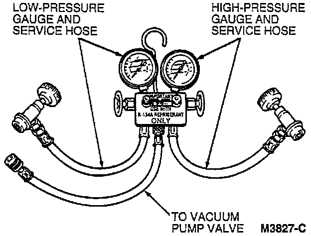 4. Connect the high- and low-pressure hose, to the respective high- and low-pressure service gauge ports.