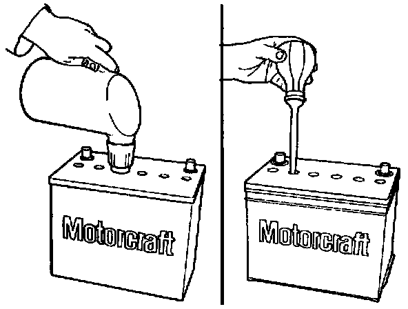 For batteries with removable vent caps, one of the most important on-vehicle services is to maintain the correct electrolyte level. Two devices are available for this purpose: a self-leveling filler which allows the battery to be filled to a predetermined level automatically and a syringe-type tiller.