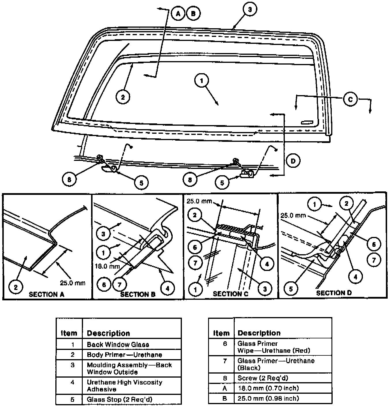 CAUTION: Use only urethane for service of air and water leaks in urethane-set back windows. When replacing urethane-Installed glass parts, do not drive the vehicle until the urethane has cured. At temperatures above 13°C (55°F) and relative humidities above 50%, adequate cure time is typically 12 to 24 hours (less at higher temperatures and lower humidities). See detailed instructions provided by the urethane manufacturer. Inadequate or improper curing may adversely affect the retention of the back window.