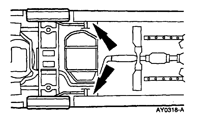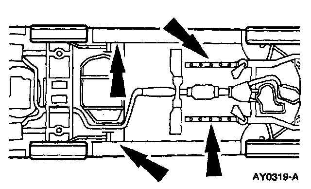 - Do not allow the hoist adapters to contact the front wheel drive shaft joints, steering linkage, suspension arms, stabilizer bar, or compress the stabilizer bar link insulators. Damage to the suspension, exhaust and steering linkage components may occur if care is not exercised when positioning the hoist adapters of two-post lifts prior to lifting the vehicle.