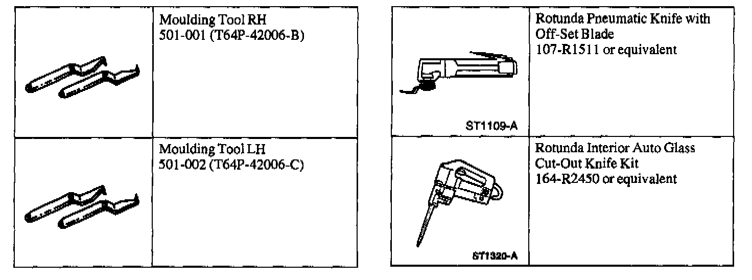 ^ Remove the windshield glass and the moulding assemblies from the vehicle and place them on a work table.