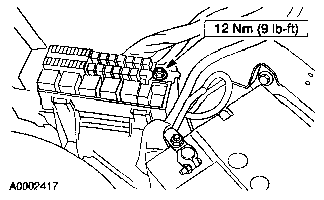 2. Remove the Battery Junction Box (BJB) cover and remove the attachment nut securing the positive cable.