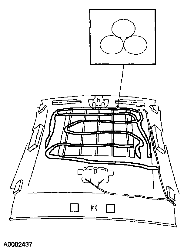 2. Apply Headliner Adhesive FIVY-19562-A or equivalent meeting Ford specification WSS-M2G355-B in a triangular pattern to the center of the headliner.