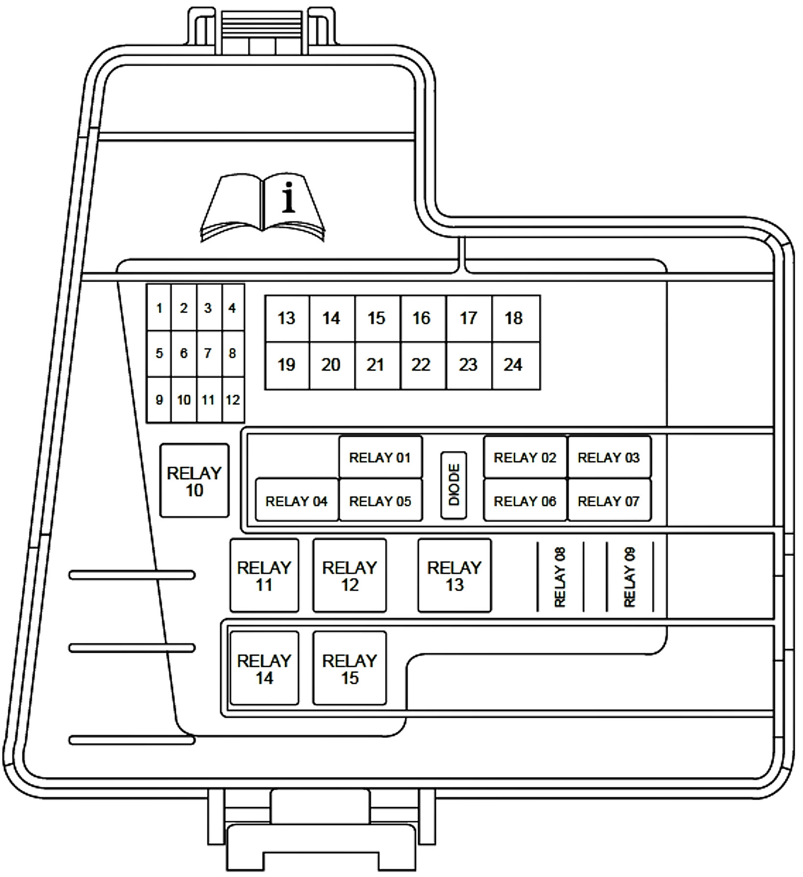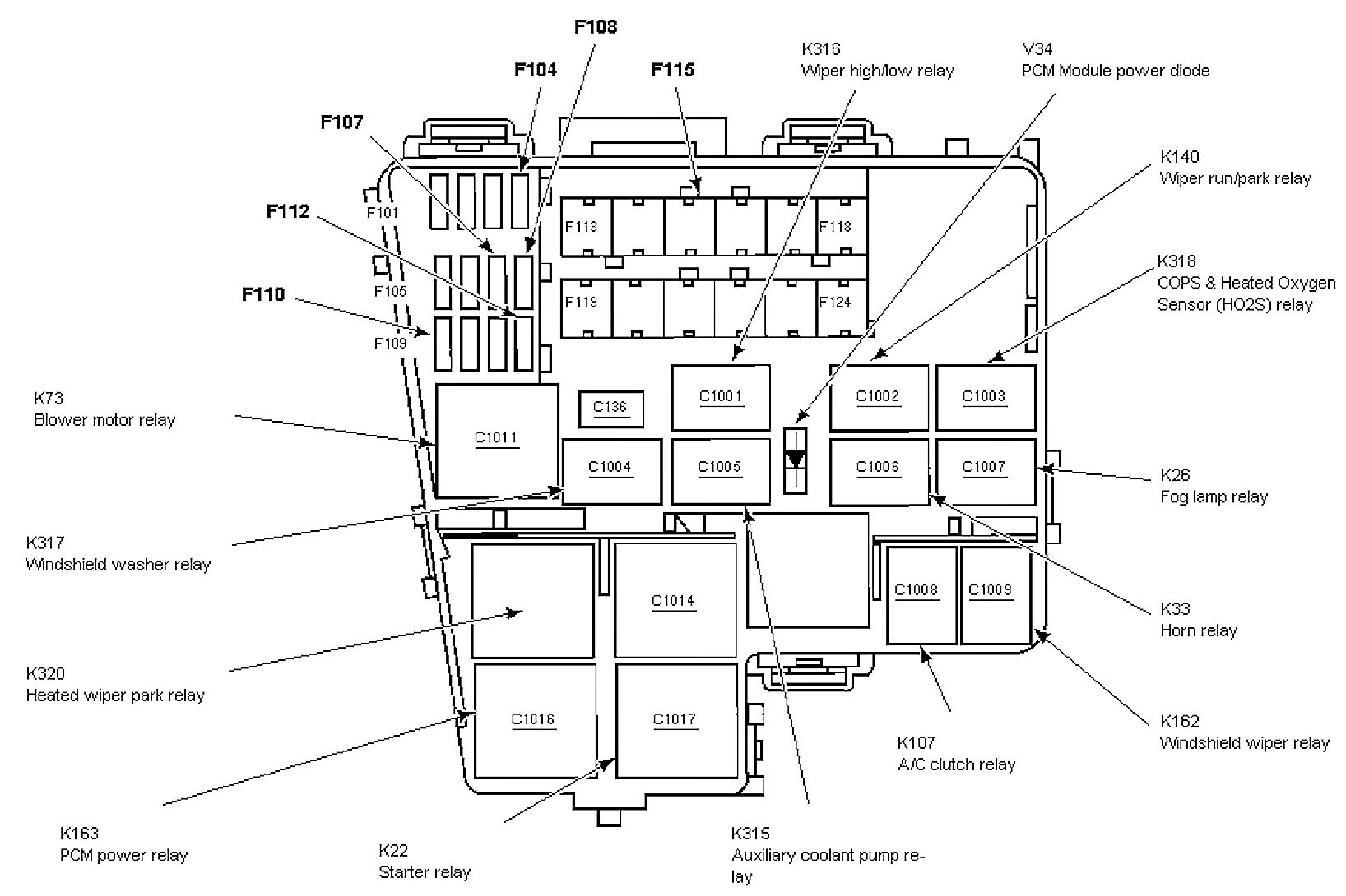 ALLDATA Editor's Note: Ford identifies this one component by 2 different names. Users have reported success comparing these images to determine Application/ID or Location of Fuses and Relays with the Front Power Distribution Box / Auxiliary Junction Box (AJB), underhood.