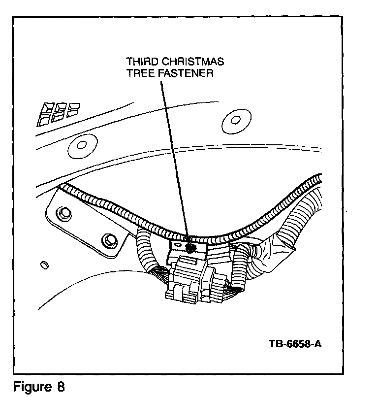 l. Secure the third Christmas Tree fastener into the vacant hole on top of the in-line electrical connector bracket located in the right rear of the engine compartment. Continue to route the Jumper Harness along the engine compartment wiring harness. Secure with a strip tie. Refer to Figure 8.