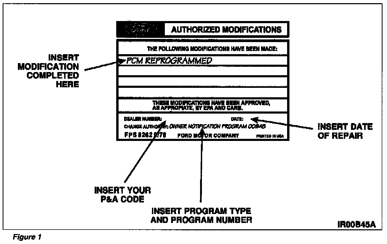 2. Obtain and prepare the Authorized Modifications Label. Write the modification completed, your P & A Code, date of repair and the program type and program number as shown.