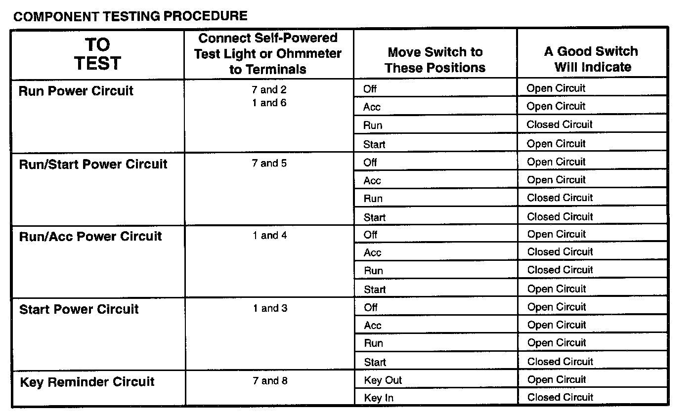 The component connector MUST BE REMOVED before testing. To test a single circuit within the component, select that circuit under the column TO TEST. If you wish to test the complete component, perform all tests.