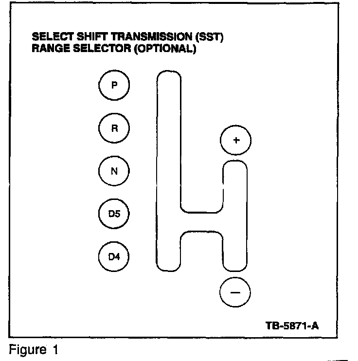 The optional Select Shift Transmission (SST) version of the transmission range selector has seven positions. This version also allows the driver to manually select the appropriate upshift or downshift and gear range. The positions of this version are: P, R, N, D5 or D4 and + or - (Figure 1).