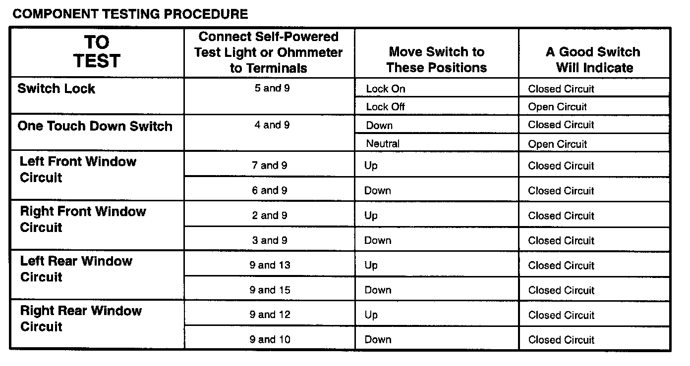 The component connector MUST BE REMOVED before testing. To test a single circuit within the component, select that circuit under the column TO TEST. If you wish to test the complete component, perform all tests.