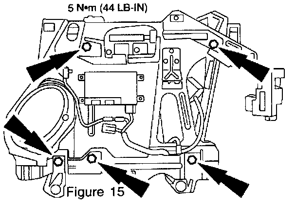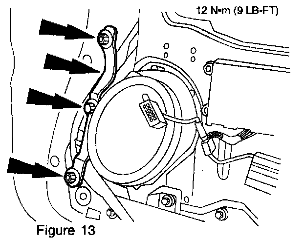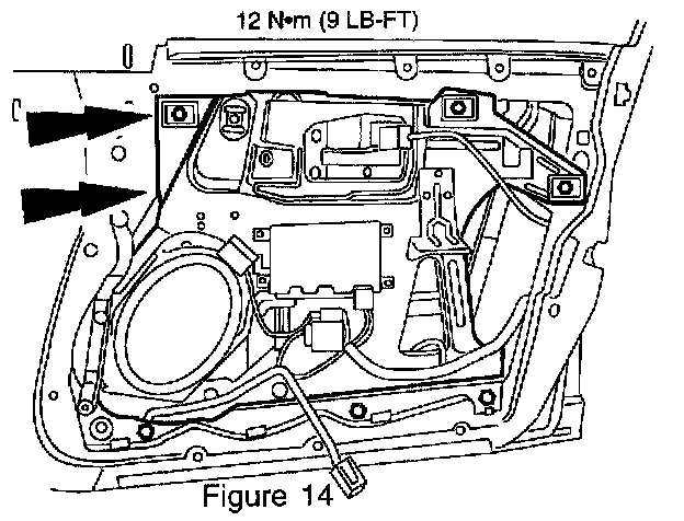 7. Remove the bolts and the front door inner support and remove the regulator assembly (Figures 14 and 15).
