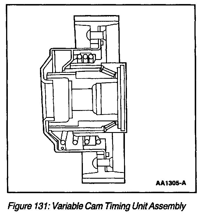 The variable cam timing unit assembly (Figure 131) is coupled to the camshaft through a helical spline in the VCT unit chamber. When the flow of oil is shifted from one side of the chamber to the other, the differential change in oil pressure forces the piston to move linearly along the axis of the camshaft. This linear motion is translated into rotational camshaft motion through the helical spline coupling. A spring installed in the chamber is designed to hold the camshaft in the minimum overlap position (5 degrees) when oil pressure is too low to maintain adequate position control. The camshaft is allowed to rotate up to 30 degrees.