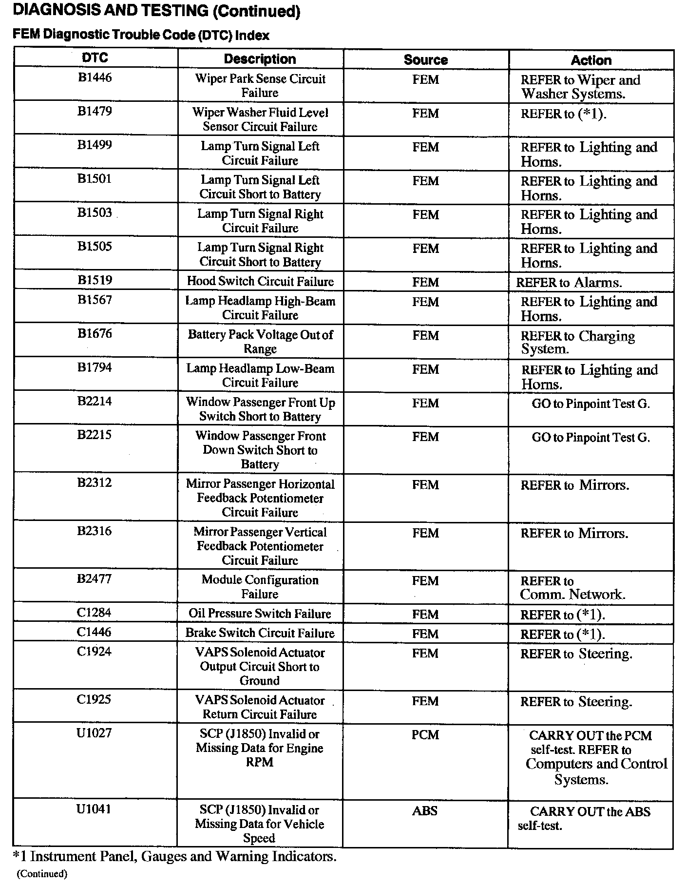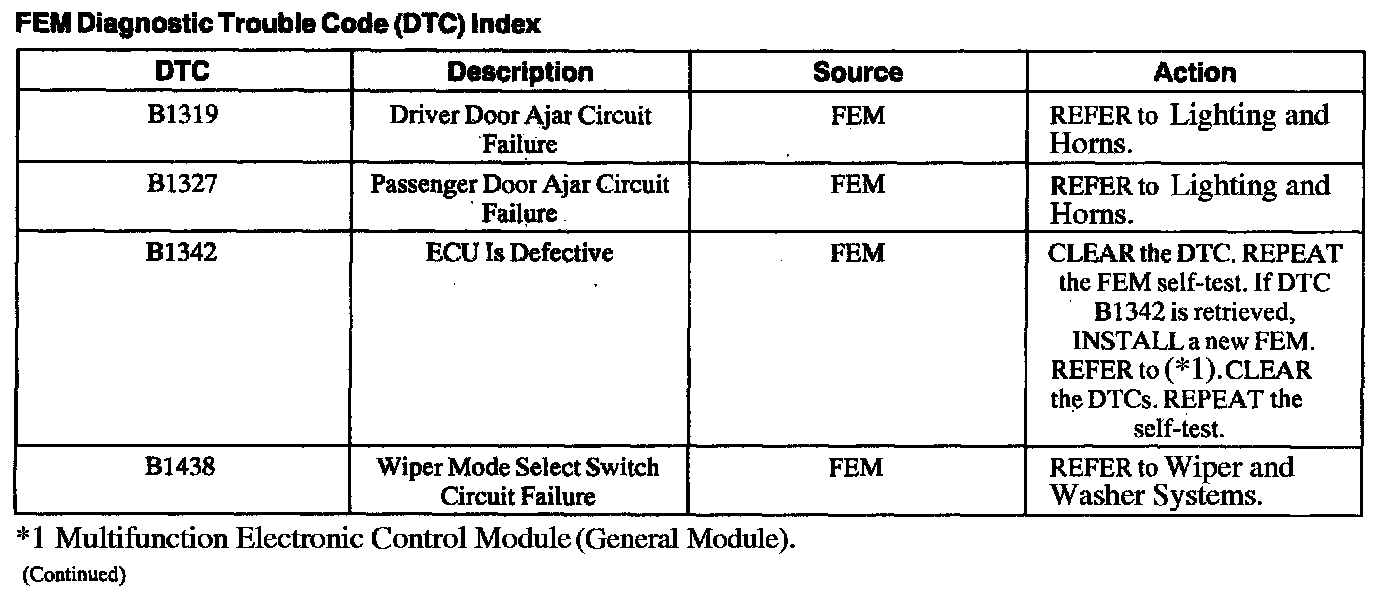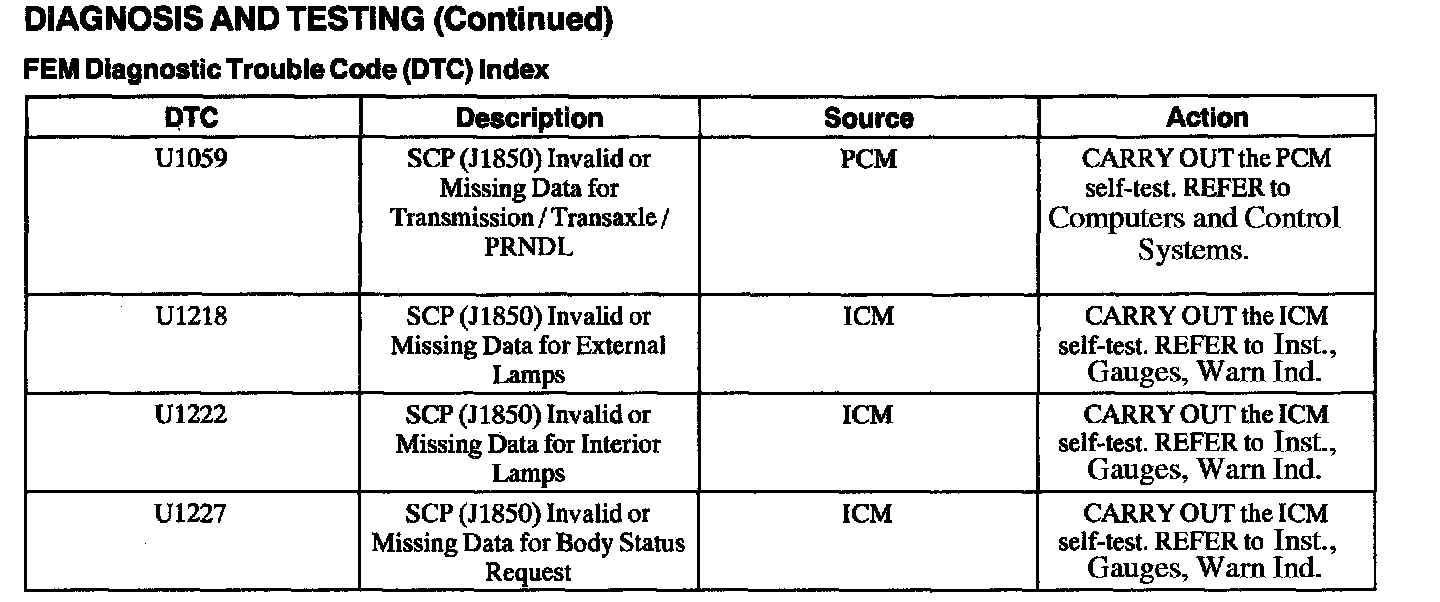 FEM Diagnostic Trouble Code (DTC) Index