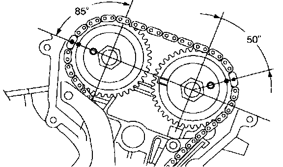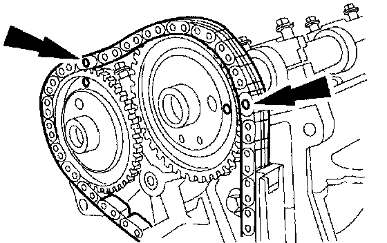 Verify that the timing index links (gold color) on the LH timing chain are in alignment with the timing index marks on the camshaft and crankshaft sprockets.