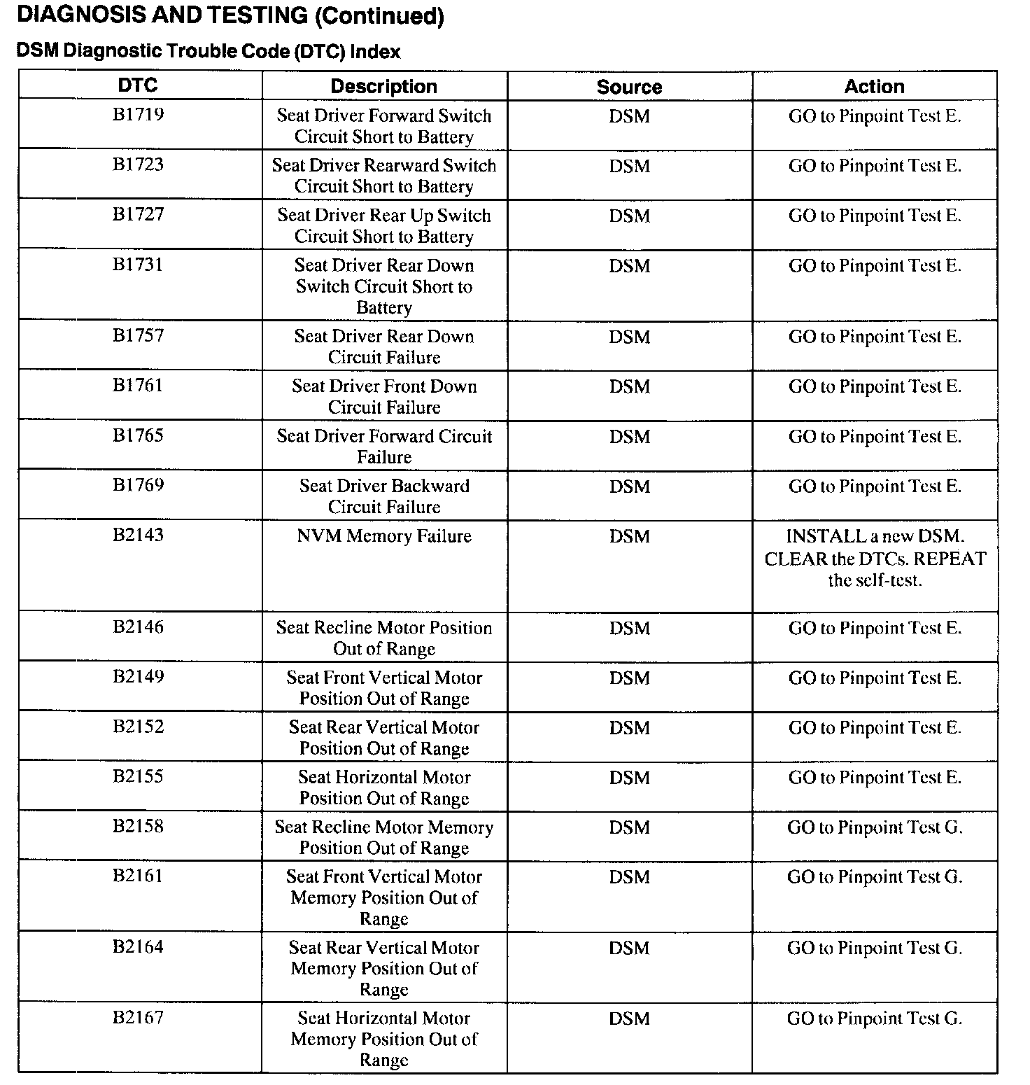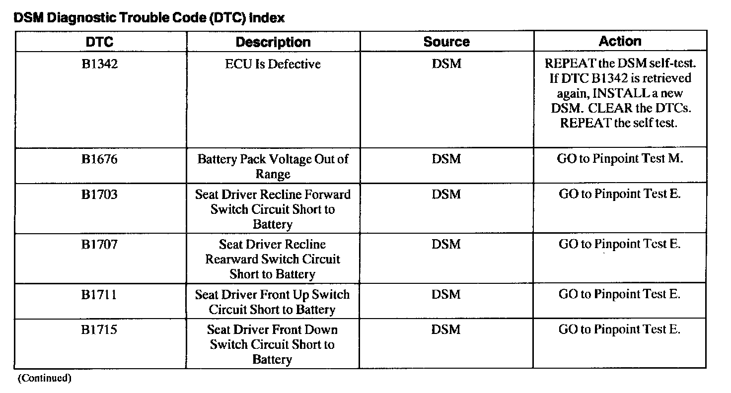 Driver Seat Module (DSM) Diagnostic Trouble Code (DTC) Index