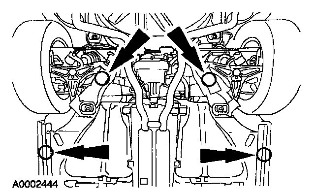 ^ Do not allow the lift adapters to contact the steering linkage, suspension arms, front I-braces, stabilizer bar, or to compress the lower suspension arm stabilizer bar insulator. Damage to the suspension, exhaust and steering linkage components may occur if care is not exercised when positioning the lift adapters prior to lifting the vehicle.