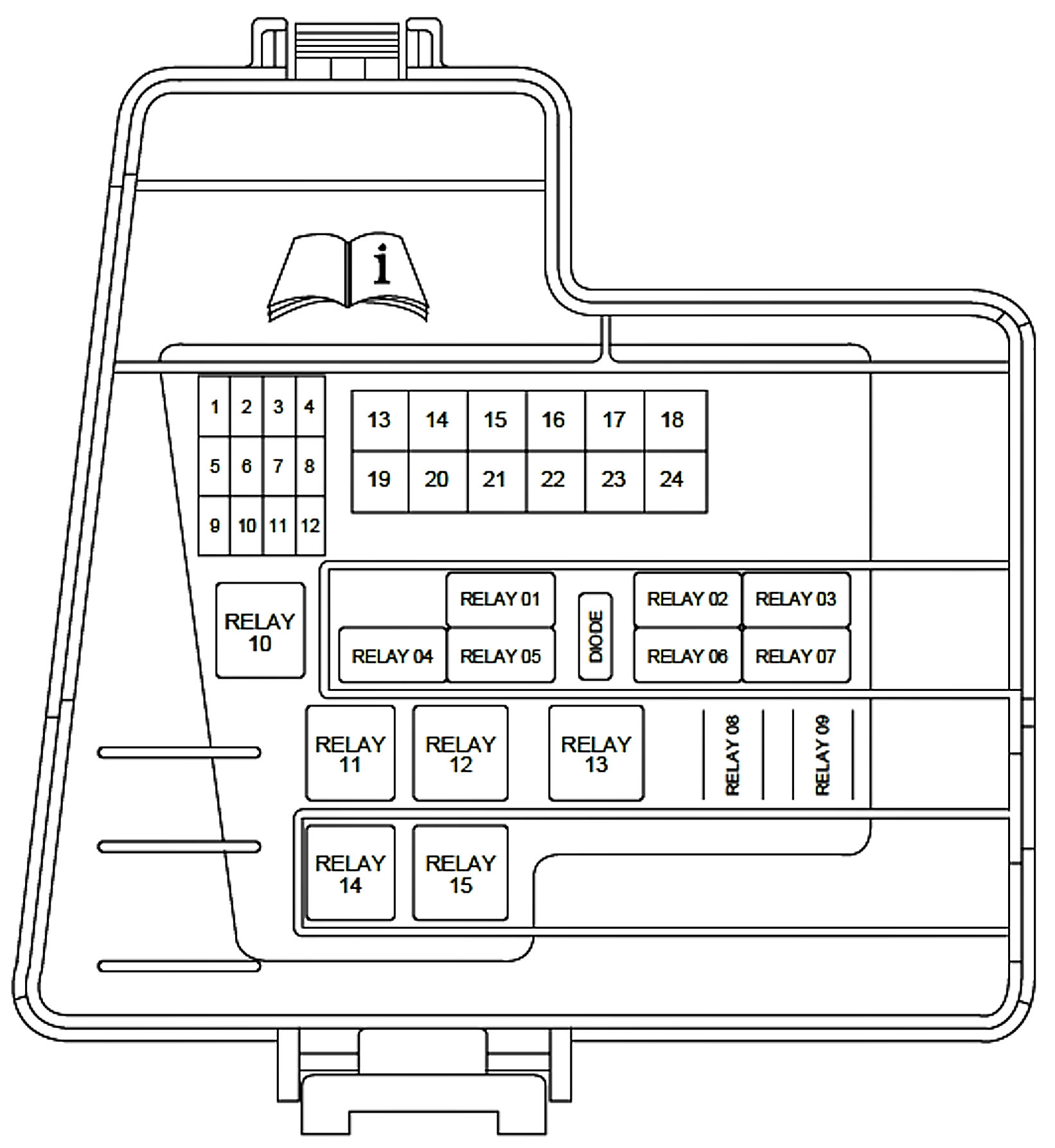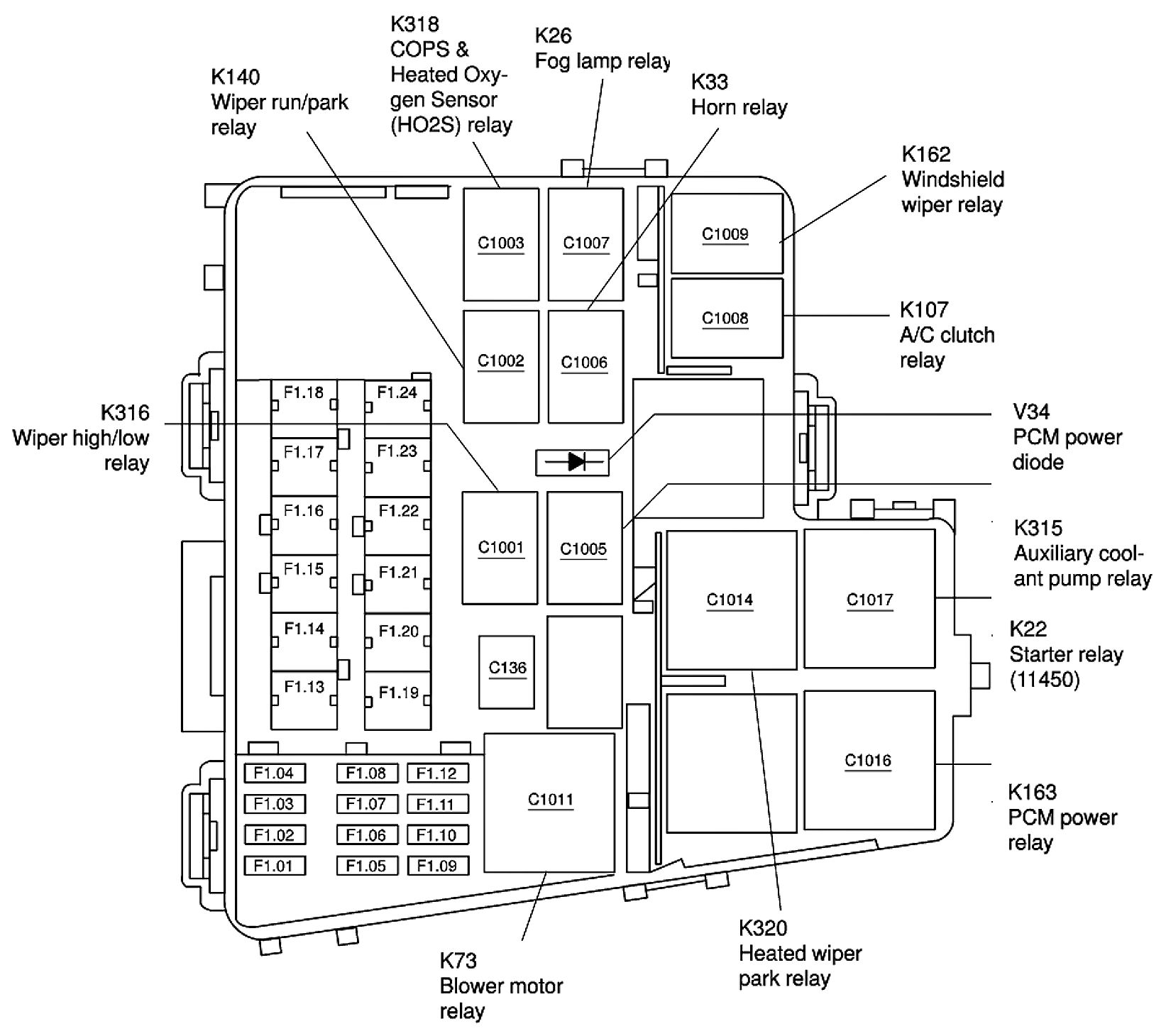 ALLDATA Editor's Note: Ford identifies this one component by 2 different names. Users have reported success comparing these images to determine Application/ID or Location of Fuses and Relays with the Front Power Distribution Box / Auxiliary Junction Box (AJB), underhood.