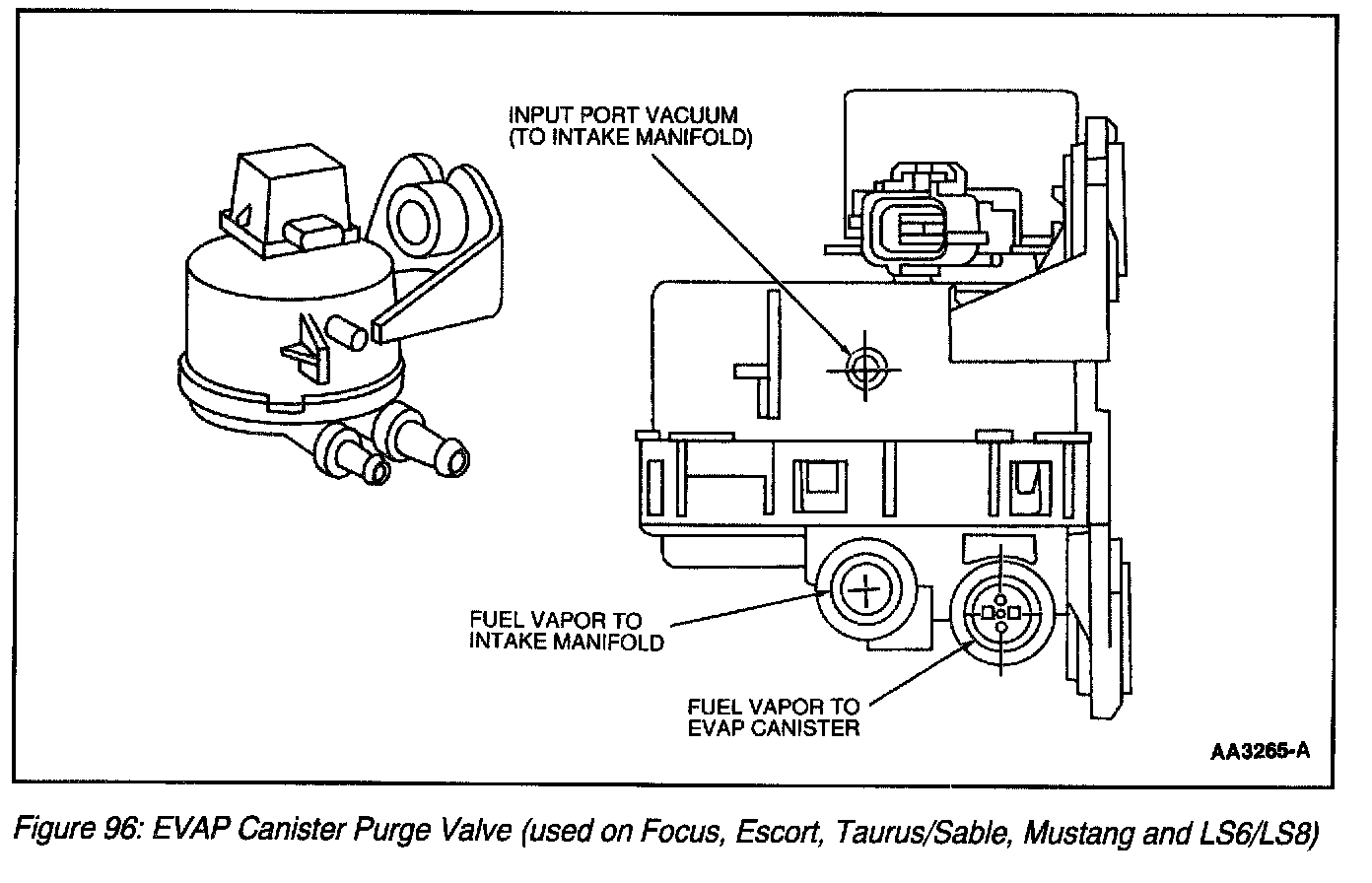 The EVAP canister purge valve (Figure 95) and (Figure 96) is the part of the Enhanced EVAP system that is controlled by the PCM. This valve controls the flow of vapors (purging) from the EVAP canister to the intake manifold during various engine operating modes. The EVAP canister purge valve is normally closed valve.