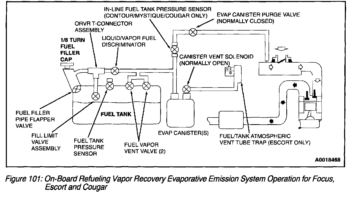 6. The fuel tank mounted fuel vapor vent valve assembly, fuel tank mounted fuel vapor control valve (or remote fuel vapor control valve) are used in the Enhanced EVAP system to control the flow of fuel vapor entering the engine. All of these valves also prevent fuel tank overfilling during refueling operation and prevent liquid fuel from entering the EVAP canister and the EVAP canister purge valve under any vehicle altitude, handling or rollover condition. The liquid/vapor fuel discriminator is part of the fuel vapor control valve assembly on Escort and Focus applications.