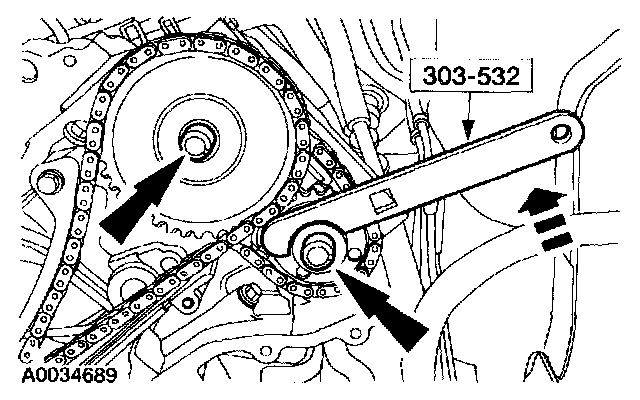 Using the special tool, apply 10 Nm (89 inch lbs.) counterclockwise to the RH exhaust camshaft sprocket and tighten the camshaft sprocket bolts in two stages.