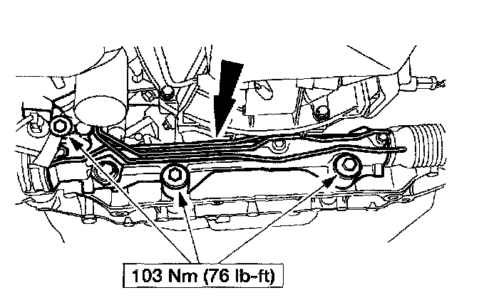 ^ Position the power steering gear to access the lower control arm rear bolt.