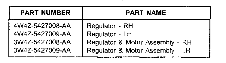 b. If seal is damaged, replace the window regulator/motor assembly. Refer to parts list for correct part number. Install window regulator/motor assembly per procedures Workshop Manual Section 501-11.