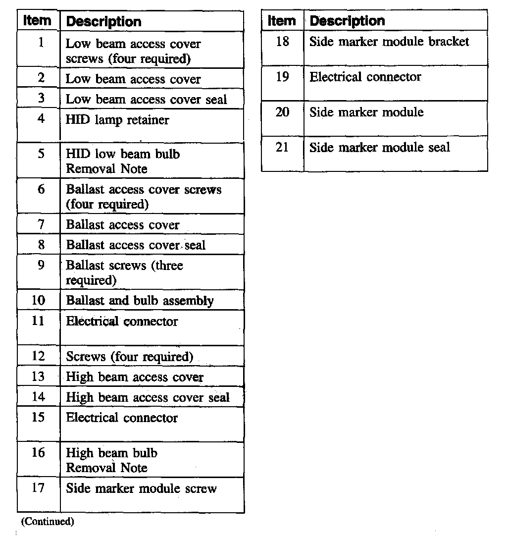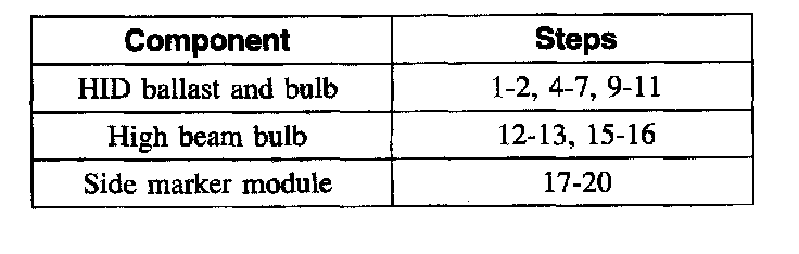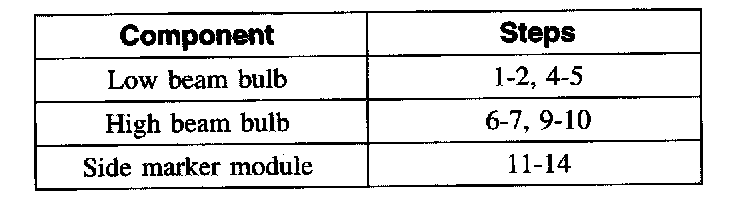 1. The headlamp bulb should not be removed from the headlamp until just before a new bulb is installed. Removing the bulb for an extended period of time may affect headlamp bulb performance. Contaminants may enter the headlamp where they can settle on the lens and reflector. Never turn on the headlamp with the bulb removed from the headlamp.
