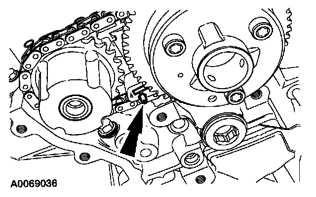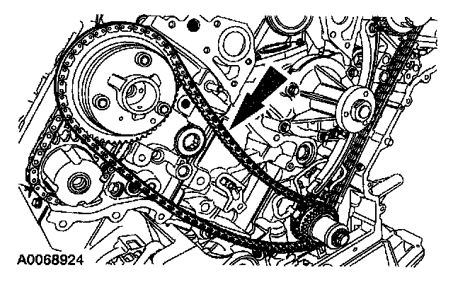 1. Collapse the LH secondary timing chain tensioner and install a pin to lock the piston.