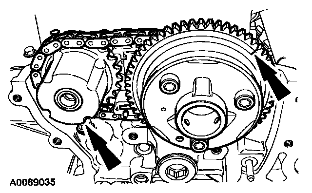 ^ Position the crankshaft gear in the timing chain.