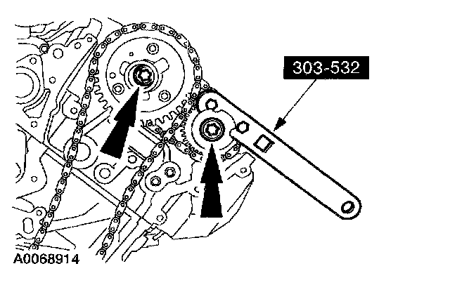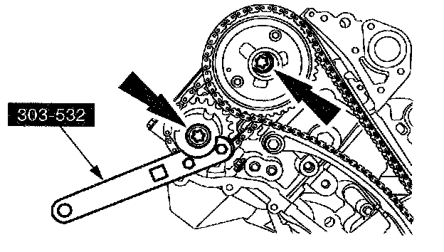 CAUTION: Using the special tool, apply 10 Nm (89 inch lbs.) counterclockwise to the RH exhaust camshaft sprocket.