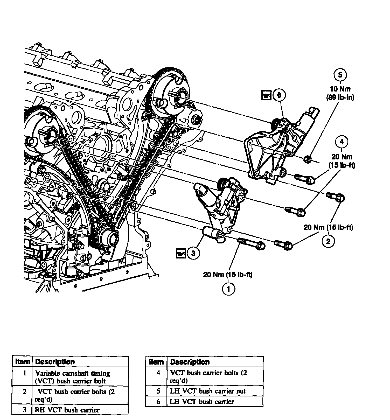 Items 28-32, and 34: LH Variable Camshaft Timing (VCT) Unit, Exhaust Camshaft Sprocket and Secondary Timing Chain Installation Note