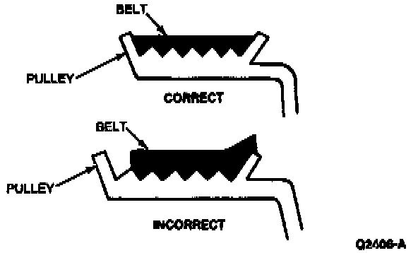 ^ With the engine running, visually observe the grooves in the pulleys (not the pulley flanges or the pulley forward faces) for excessive wobble. Install new components as necessary.