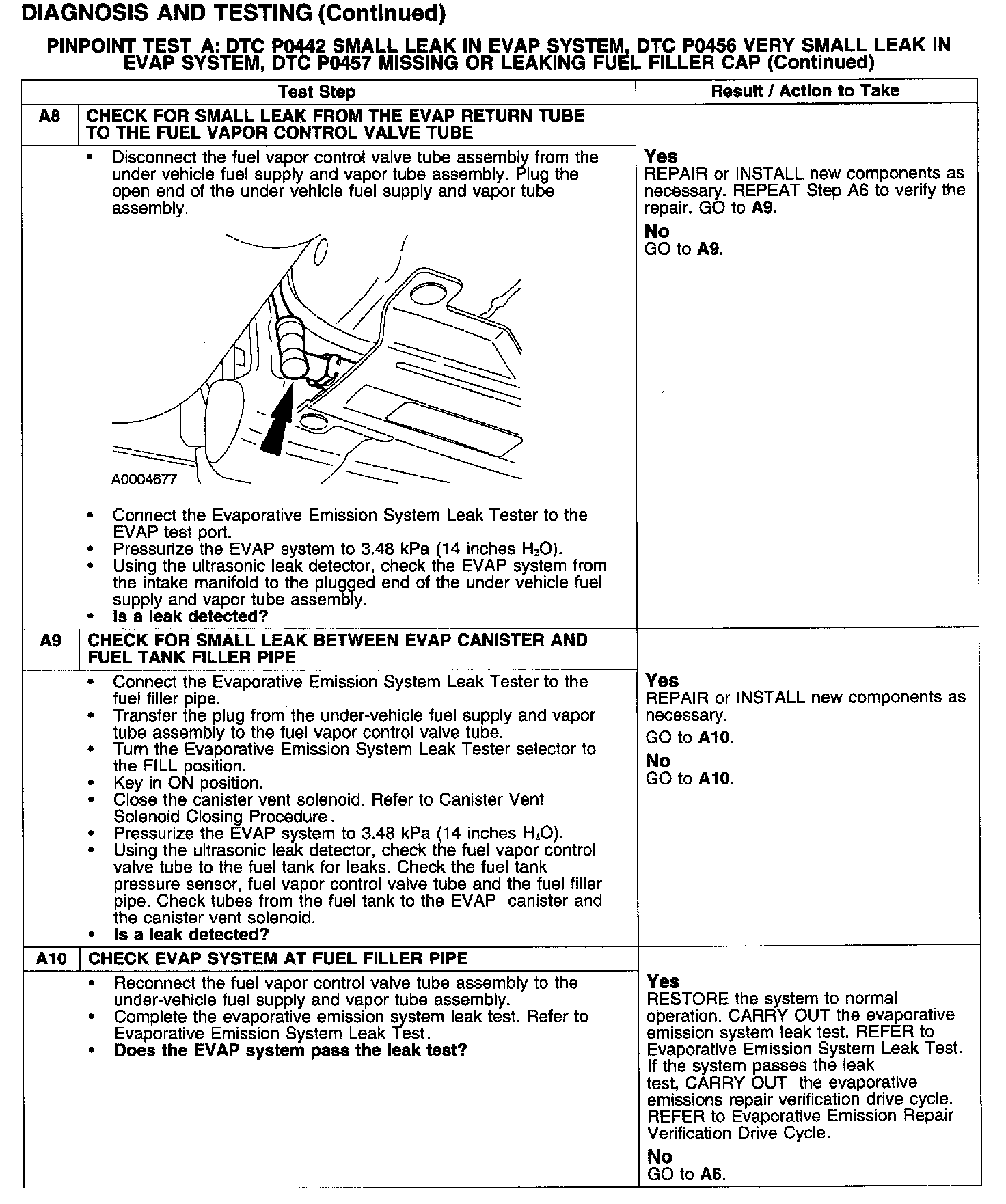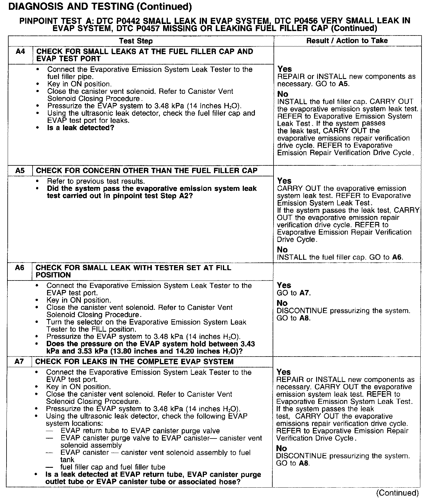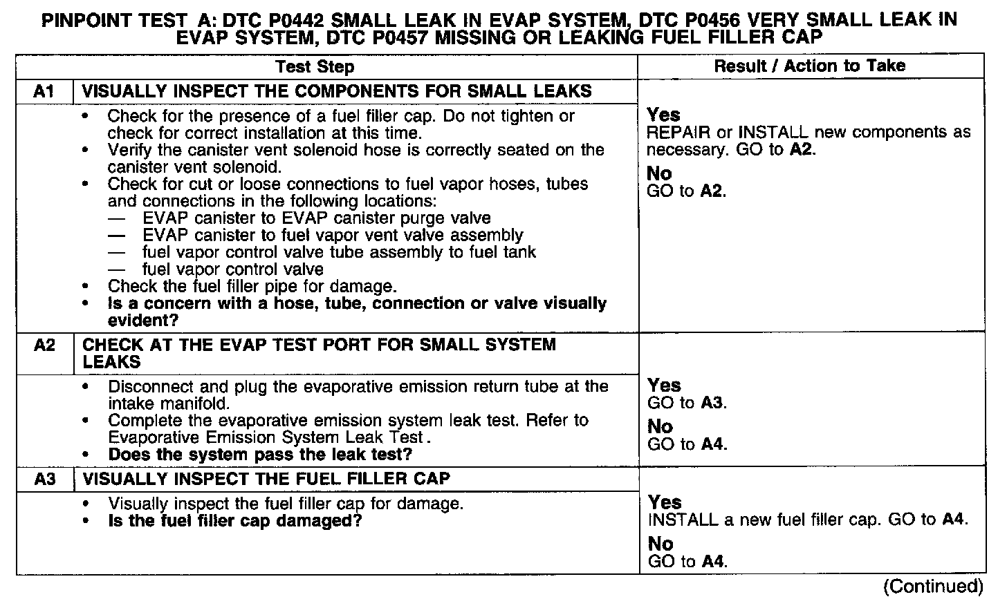 PINPOINT TEST A: DTC P0442 SMALL LEAK IN EVAP SYSTEM, DTC P0456 VERY SMALL LEAK IN EVAP SYSTEM, DTC P0457 MISSING OR LEAKING