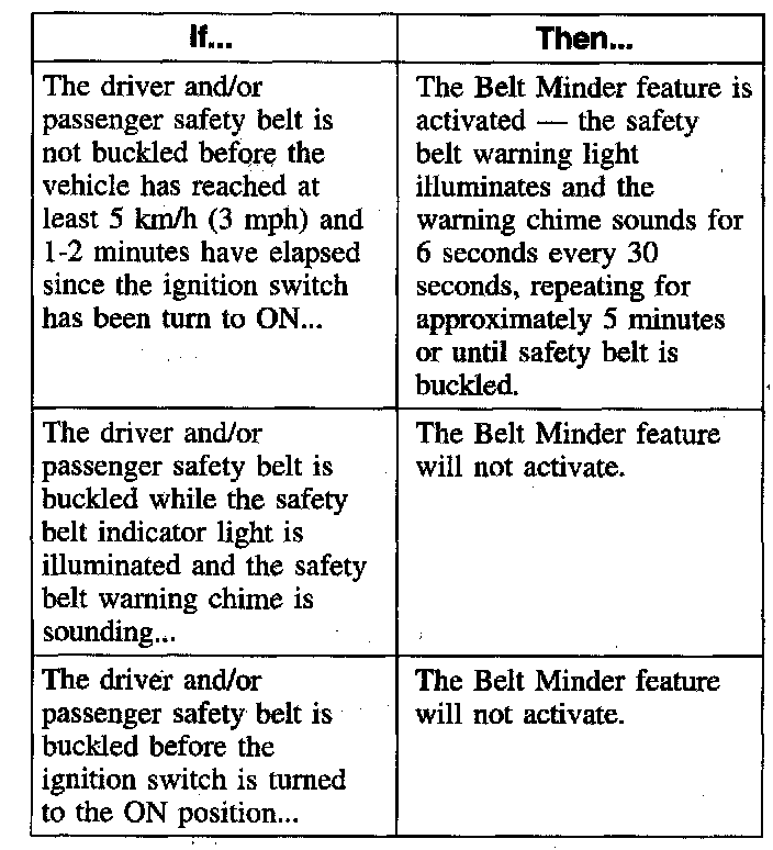 - If the driver safety belt is not buckled before the ignition key is turned to the ON position, the safety belt warning light illuminates for one to two minutes and the warning chime sounds for four to eight seconds.