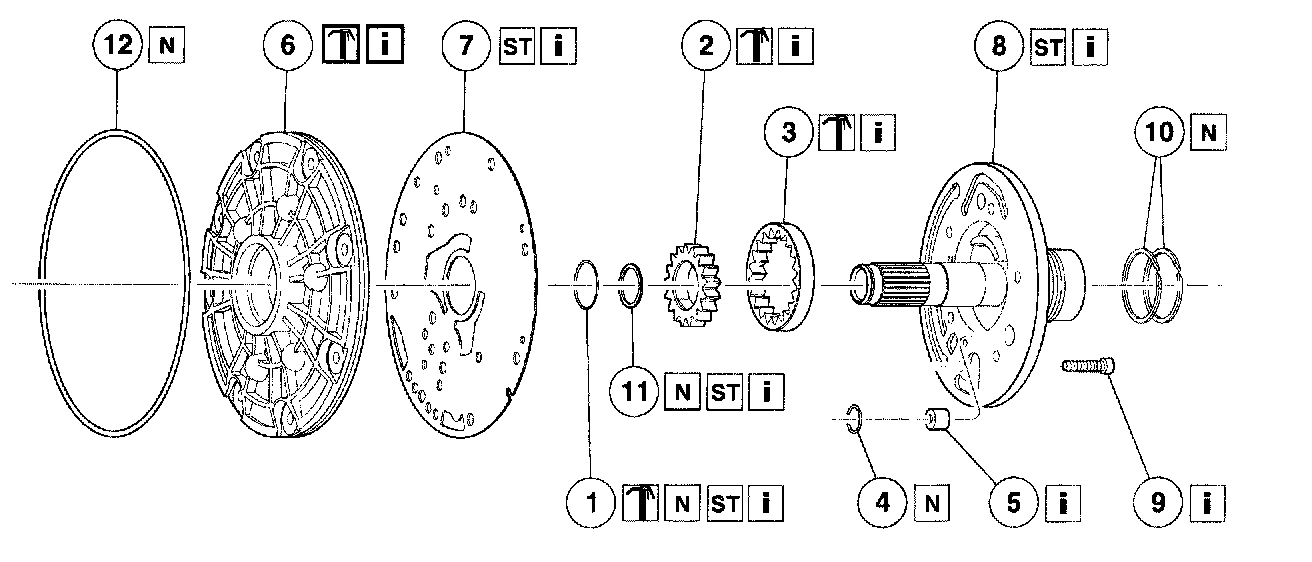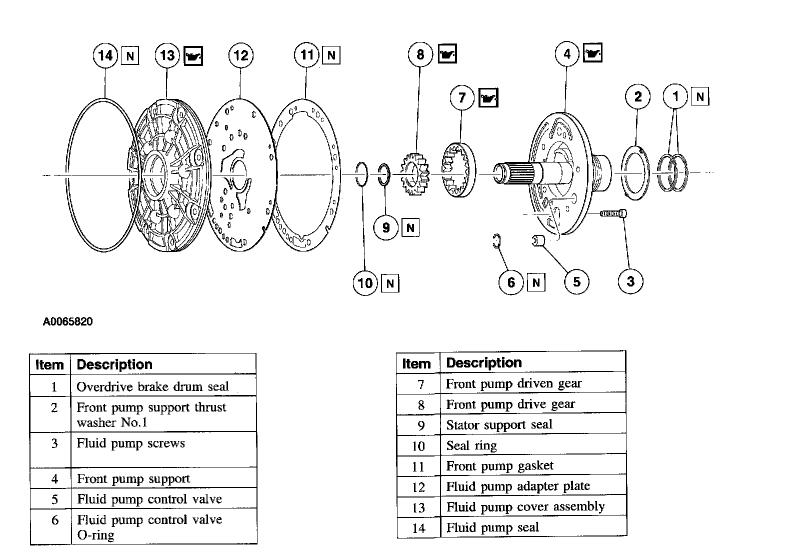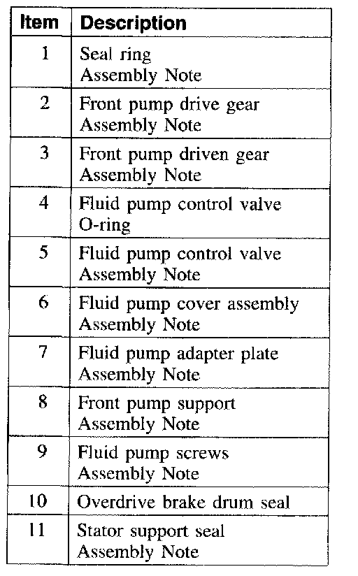 NOTE: A rough casting on the pump surface crescent is not a flaw. The fluid pump gears are part of the pump assembly and are not repaired separately. Minor burrs and scoring may be removed with crocus cloth. If damage is found, install a new assembly. The No. 1 thrust washer may be stuck to the fluid pump housing. It will need to be removed. This washer will be installed during the assembly of the transmission. The fluid pump gasket may be stuck to the fluid pump housing. It will need to be removed. A new gasket will be installed during the assembly of the transmission.