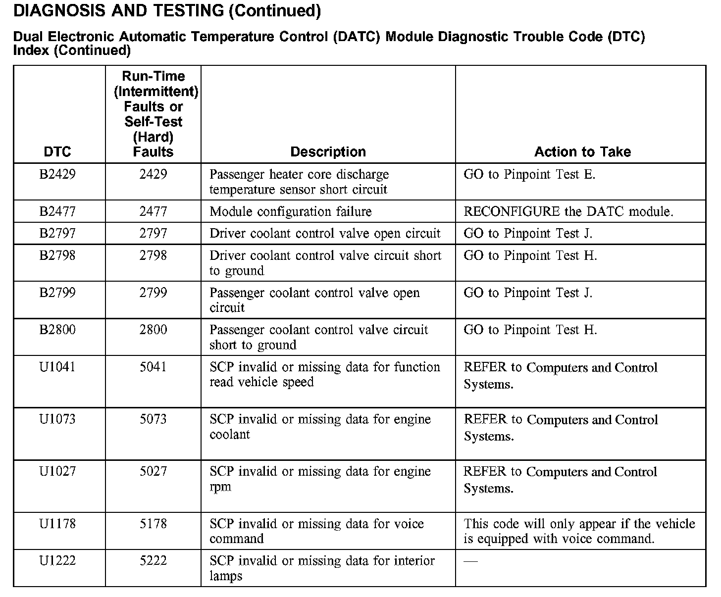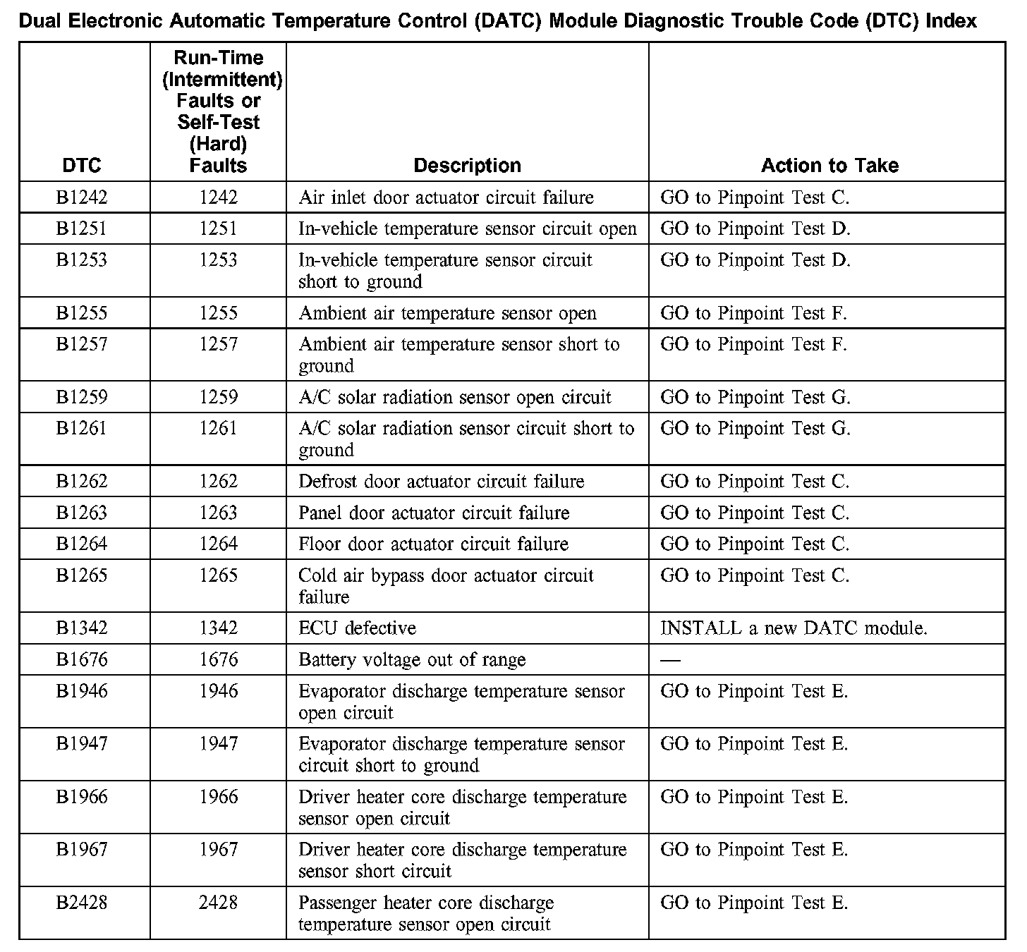 Dual Electronic Automatic Temperature Control (DATC) Module Diagnostic Trouble Code (DTC) Index