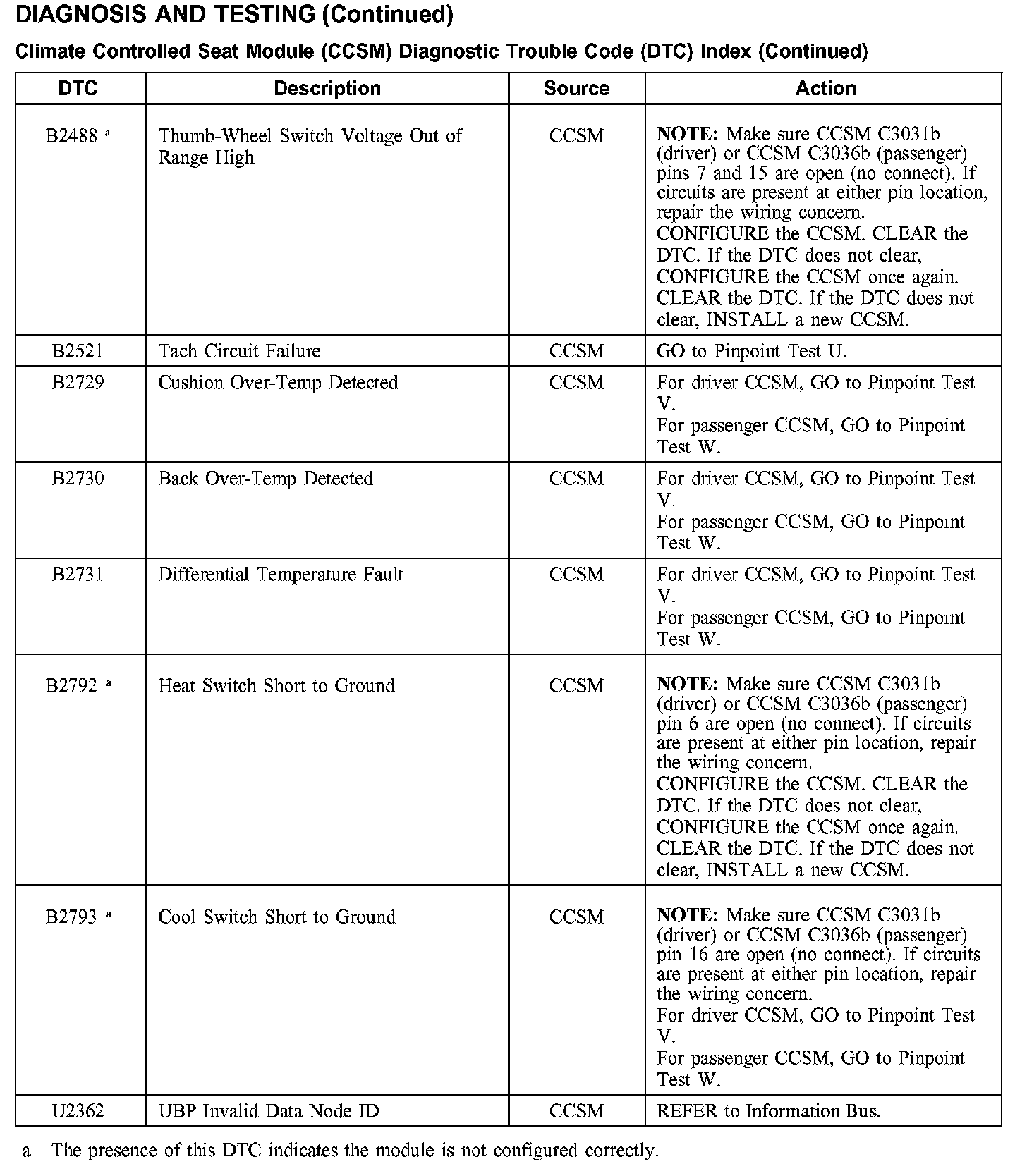 Climate Controlled Seat Module (CCSM) Diagnostic Trouble Code (DTC) Index