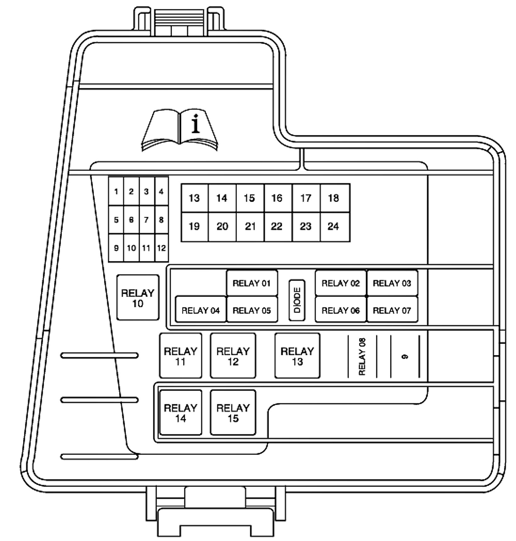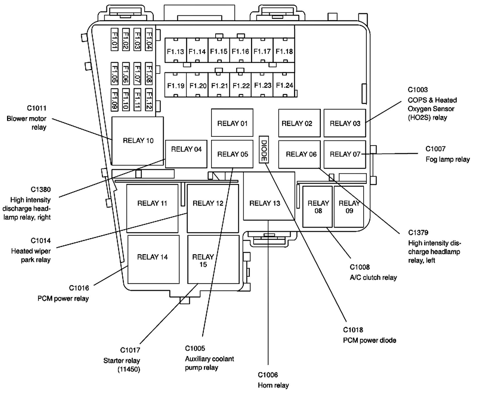 ALLDATA Editor's Note: Ford identifies this one component by 2 different names. Users have reported success comparing these images to determine Application/ID or Location of Fuses and Relays with the Front Power Distribution Box / Auxiliary Junction Box (AJB), underhood.