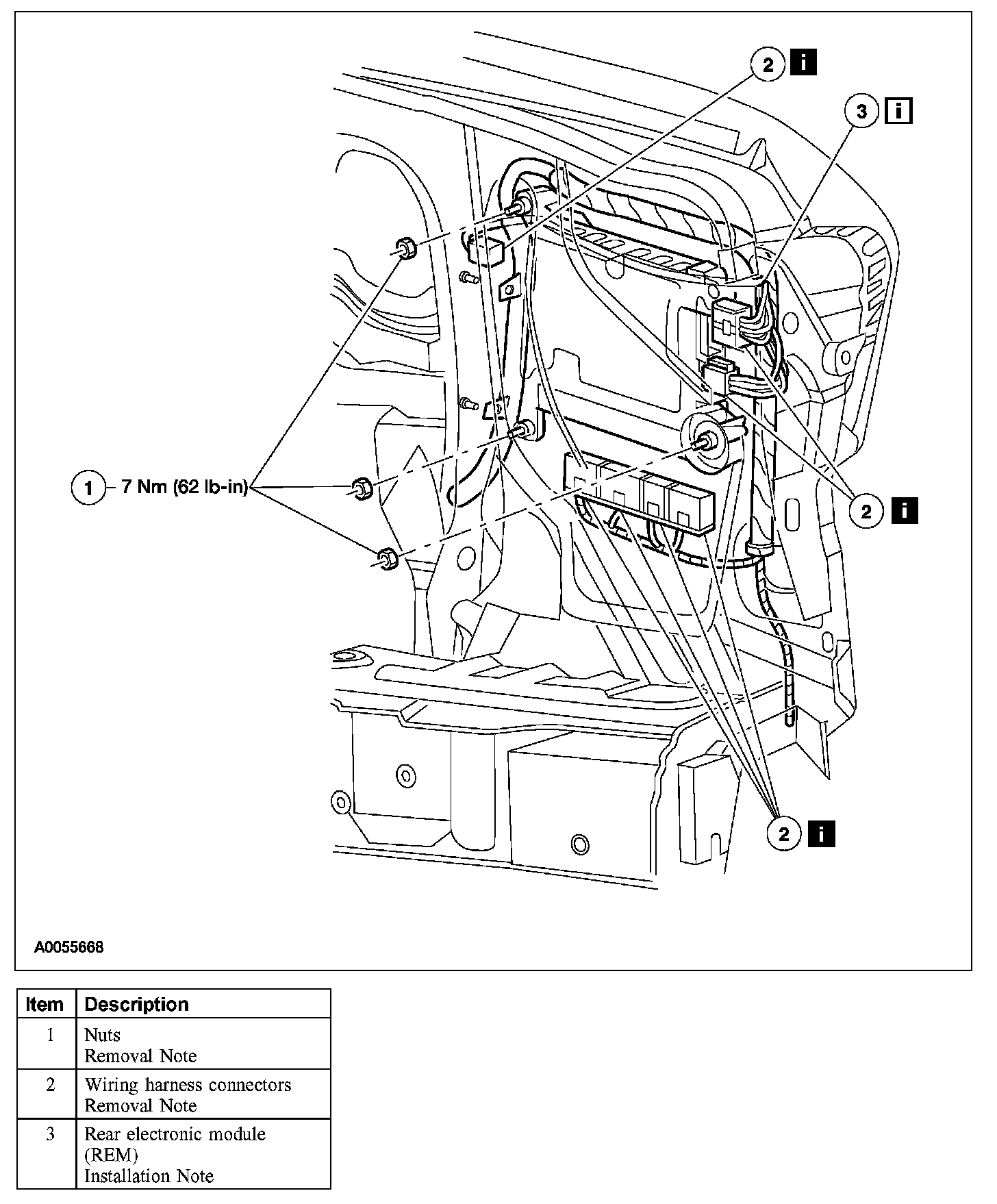 Item 2: Rear Electronic Module (REM) Wiring Harness Connector Removal Note
