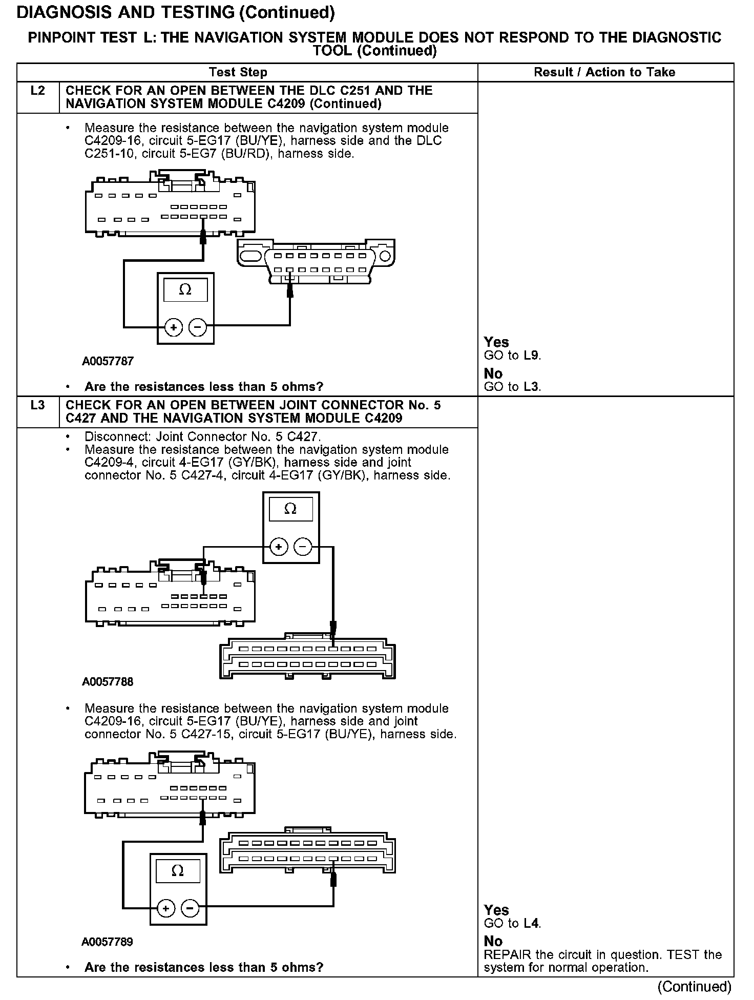 The navigation system module communicates with the diagnostic tool through the SCP communications network circuits 4-EG17 (GY/BK) and 5-EG17 (BU/YE). If one of the bus wires becomes shorted to ground or voltage, or if some but not all termination resistors are lost, communications can continue. Check circuits 4-EG17 (GY/BK) and 5-EG17 (BU/YE) between the navigation system module C4209 and the data link connector (DLC) C251. Total resistance values must not be more than 5 ohms. If the resistance is more than 5 ohms, there is either an open in circuit 4-EG17 (GY/BK) and 5-EG17 (BU/YE), damage to the DLC C251, damage to the navigation system module C4209, or a problem in the interior auxiliary junction box (AJB) C283c, C283d, joint connector No.5 C427 or joint connector No.4 C223.