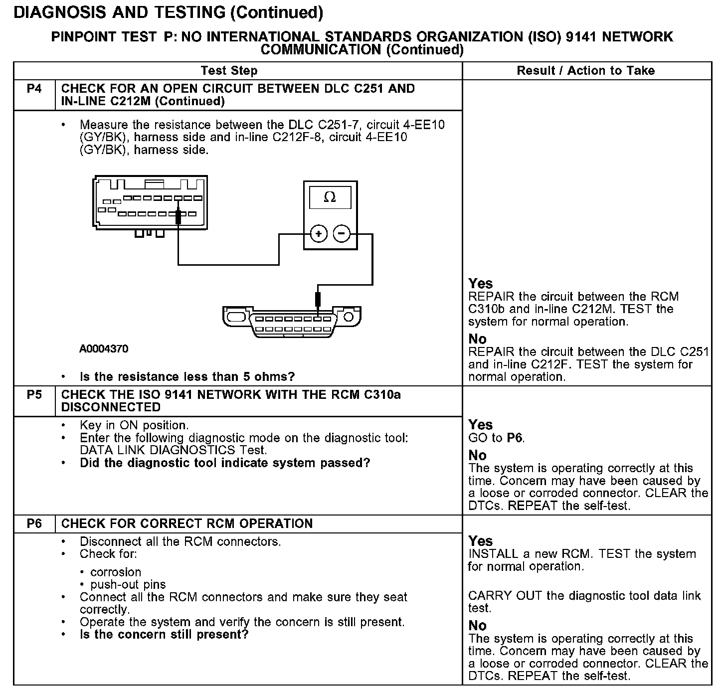 The RCM communicates with the diagnostic tool through the ISO 9141 communications network circuit 4-EE1 (GY/RD). If circuit 4-EE1 (GY/RD) becomes open or shorted to ground, communications to that module will not be possible. Check circuit 4-EE1 (GY/RD) between the RCM C310a and the DLC C251. Total resistance values must not be more than 5 ohms. If the resistance is more than 5 ohms, there is either an open in circuit 4-EE1 (GY/RD), damage to the DLC C251, in-line C212 or damage to the C310a.