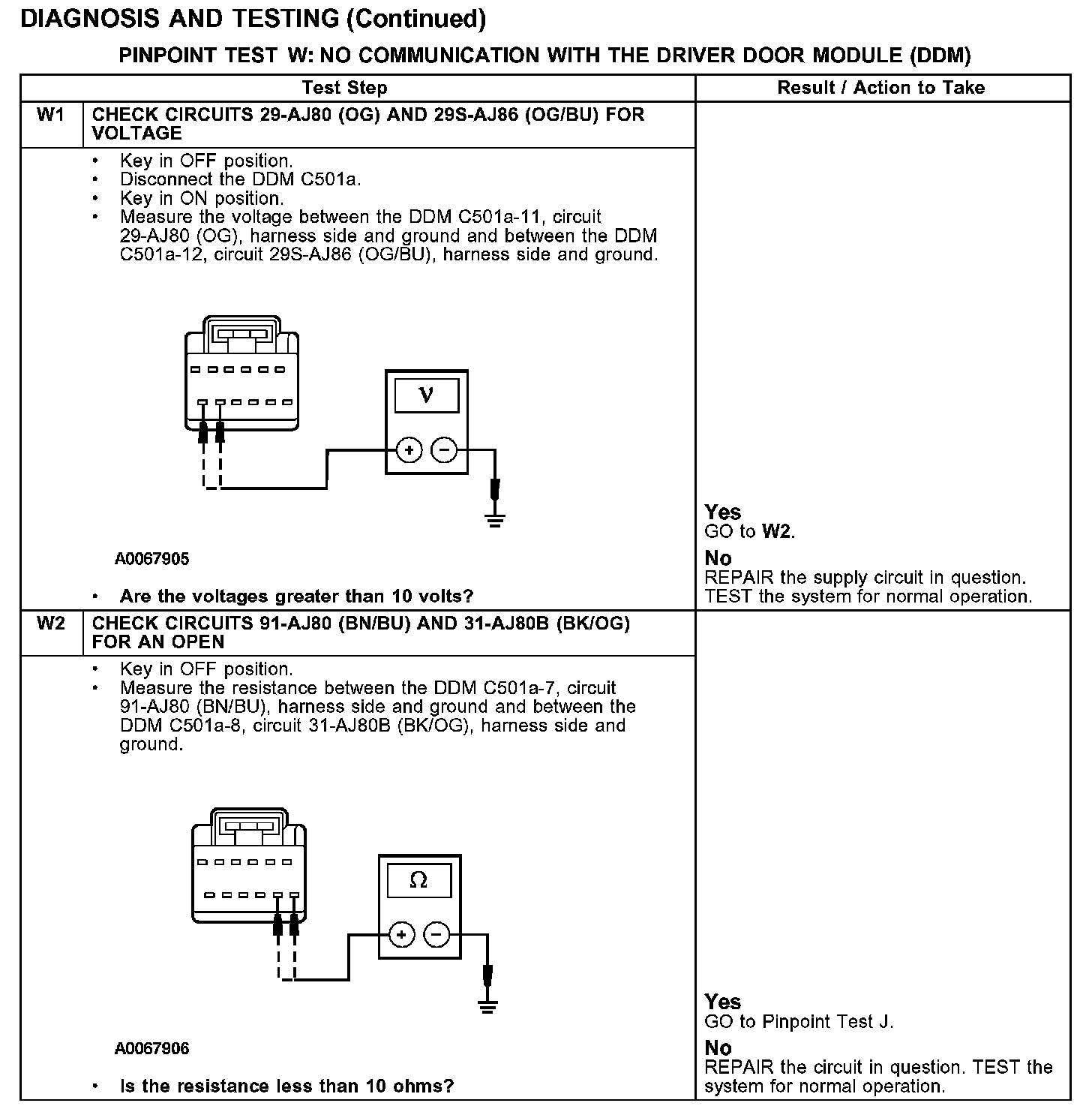PINPOINT TEST W: NO COMMUNICATION WITH THE DRIVER DOOR MODULE (DDM)Test W1-W2: