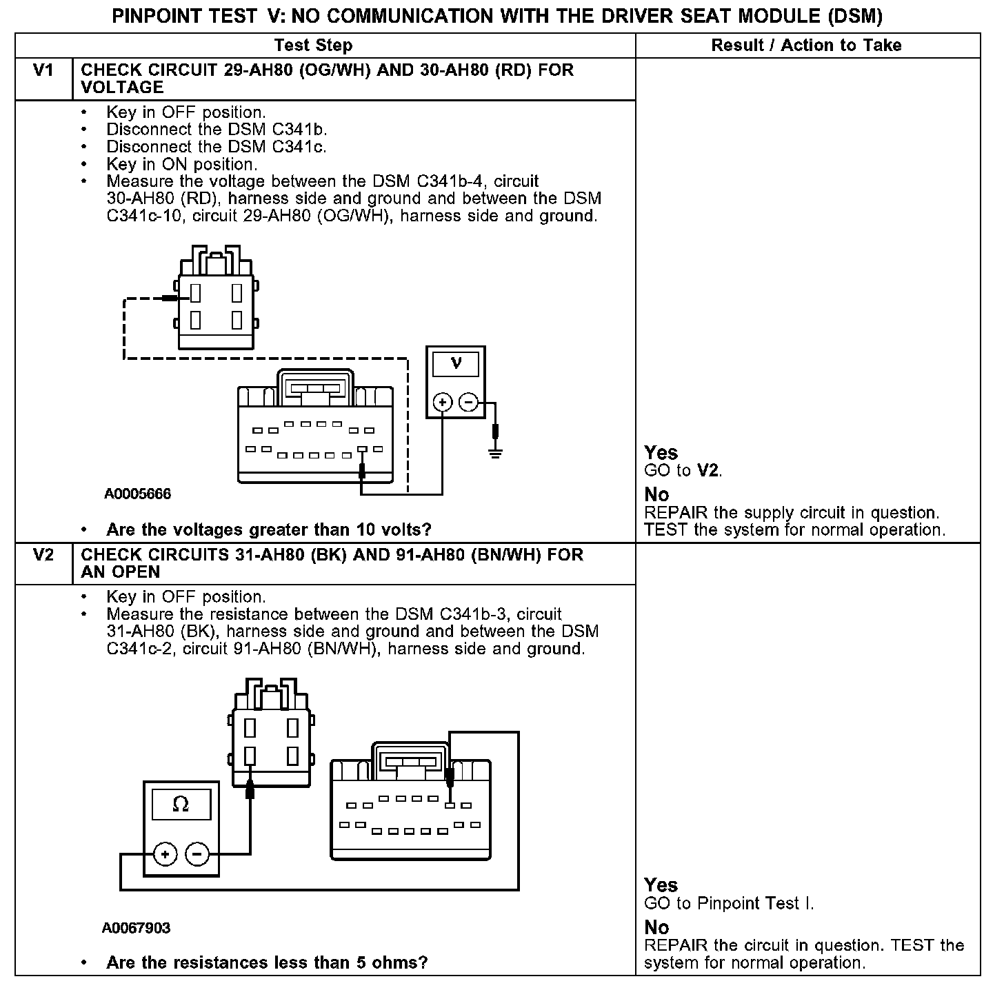 PINPOINT TEST V: NO COMMUNICATION WITH THE DRIVER SEAT MODULE (DSM)Test V1-V2: