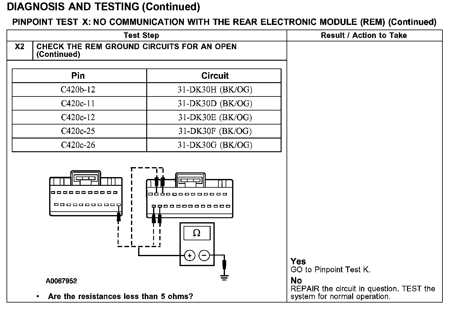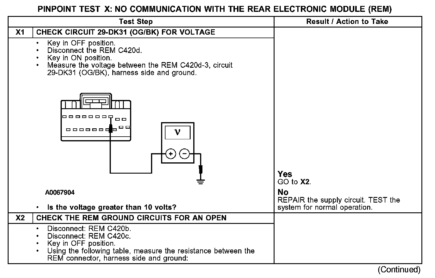 PINPOINT TEST X: NO COMMUNICATION WITH THE REAR ELECTRONIC MODULE (REM)Test X1-X2: