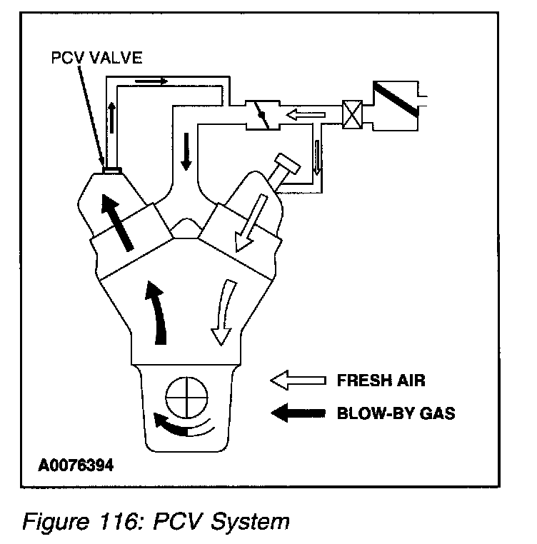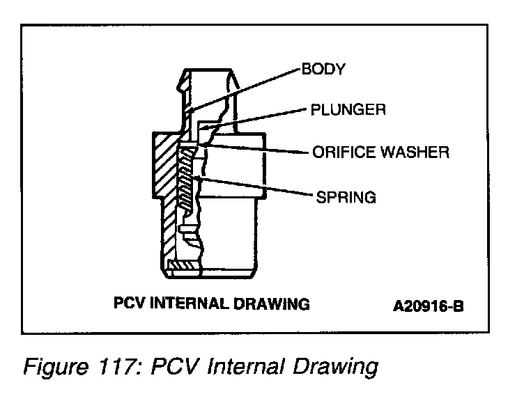 The Positive Crankcase Ventilation (PCV) System (Figure 116) cycles crankcase gases back through the induction system into the engine where they are burned. The PCV valve regulates the amount of ventilated air and blow-by gases to the intake manifold and prevents backfire from traveling into the crankcase.
